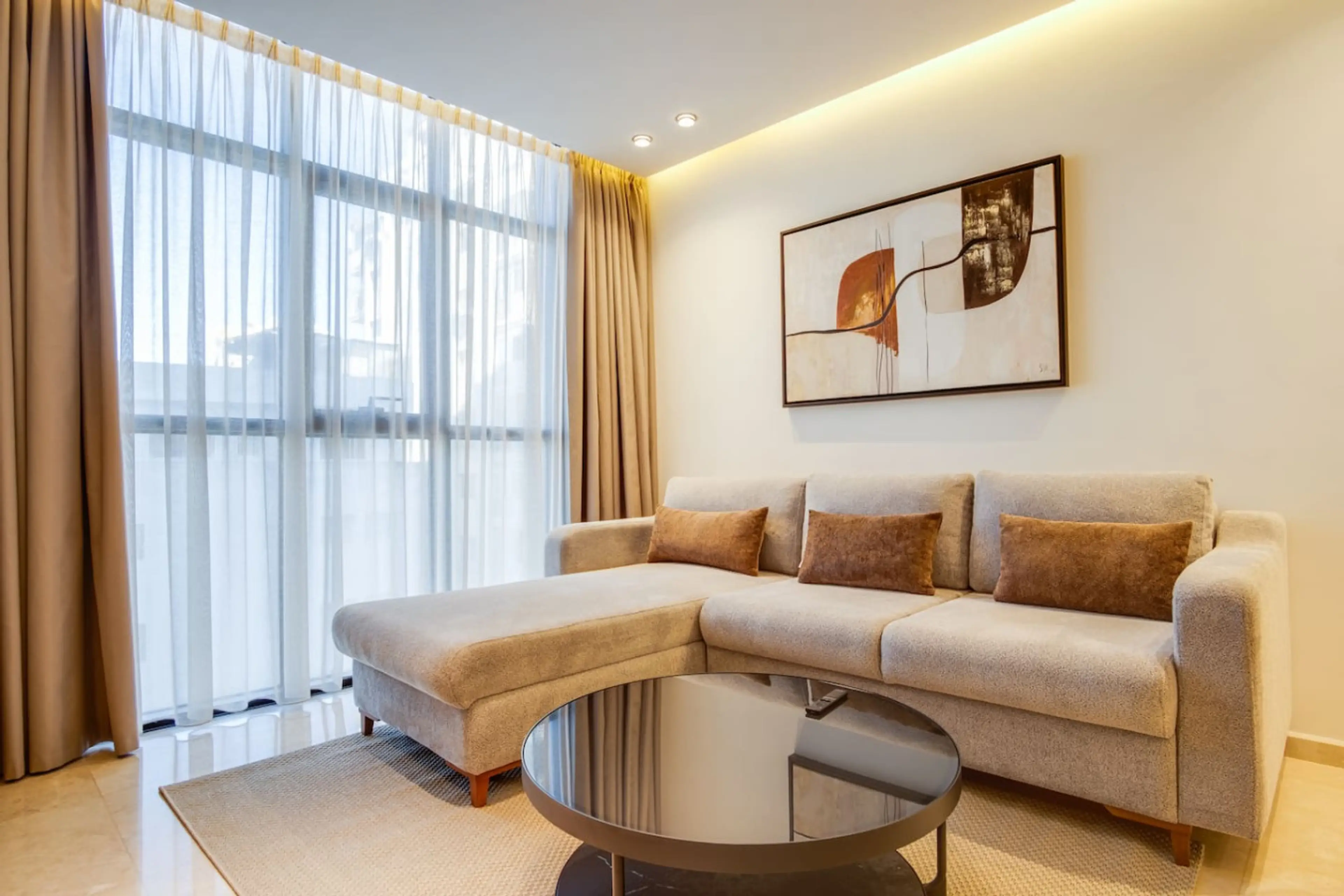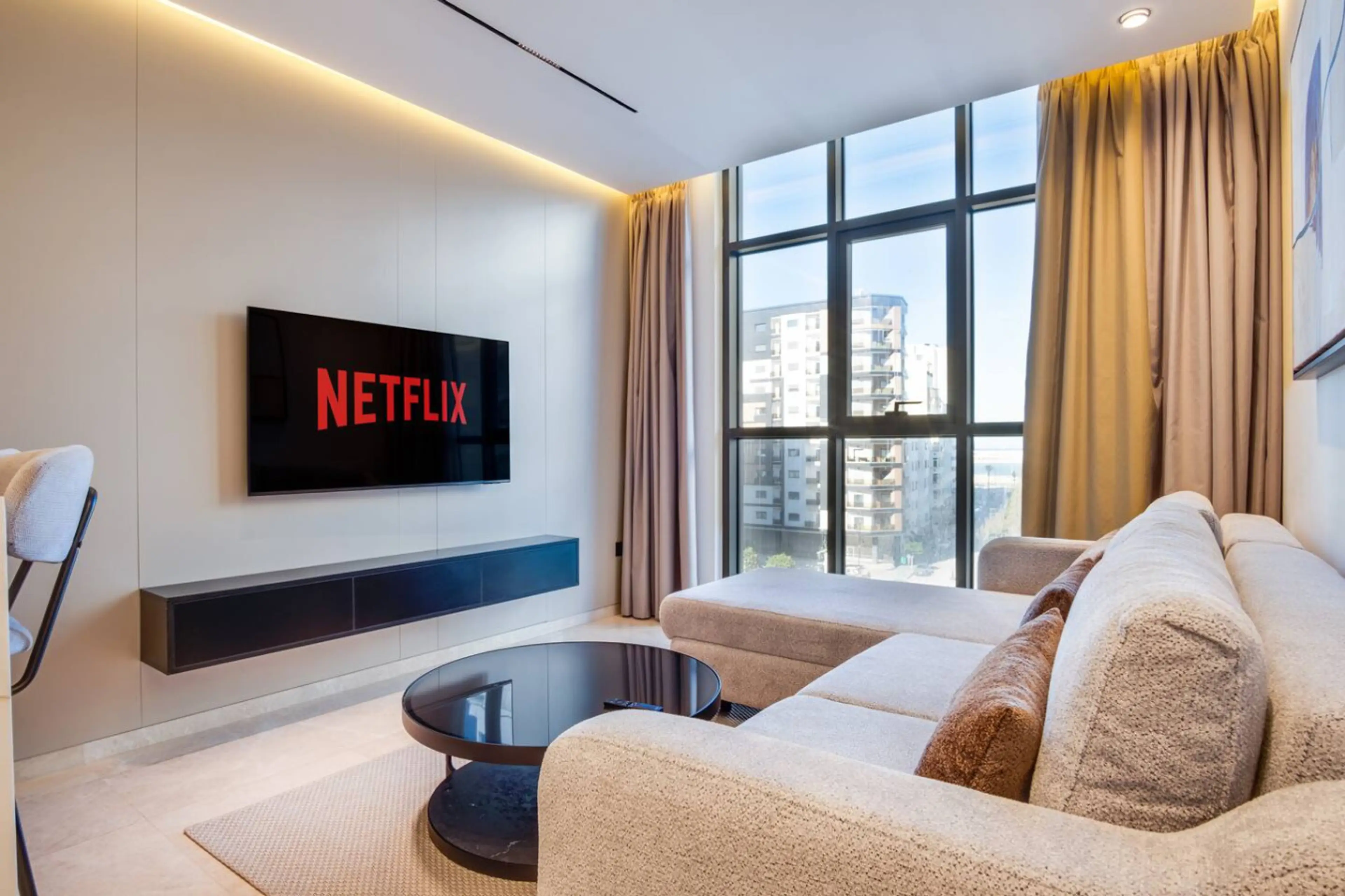 Modern apartment in a new building just steps from the beach, offering a partial beach view from the living room and balcony. It features one elegant bedroom with comfy beds, central AC (cooling & heating), a large smart TV with Netflix and premium channels, and an open kitchen connected to the livi...