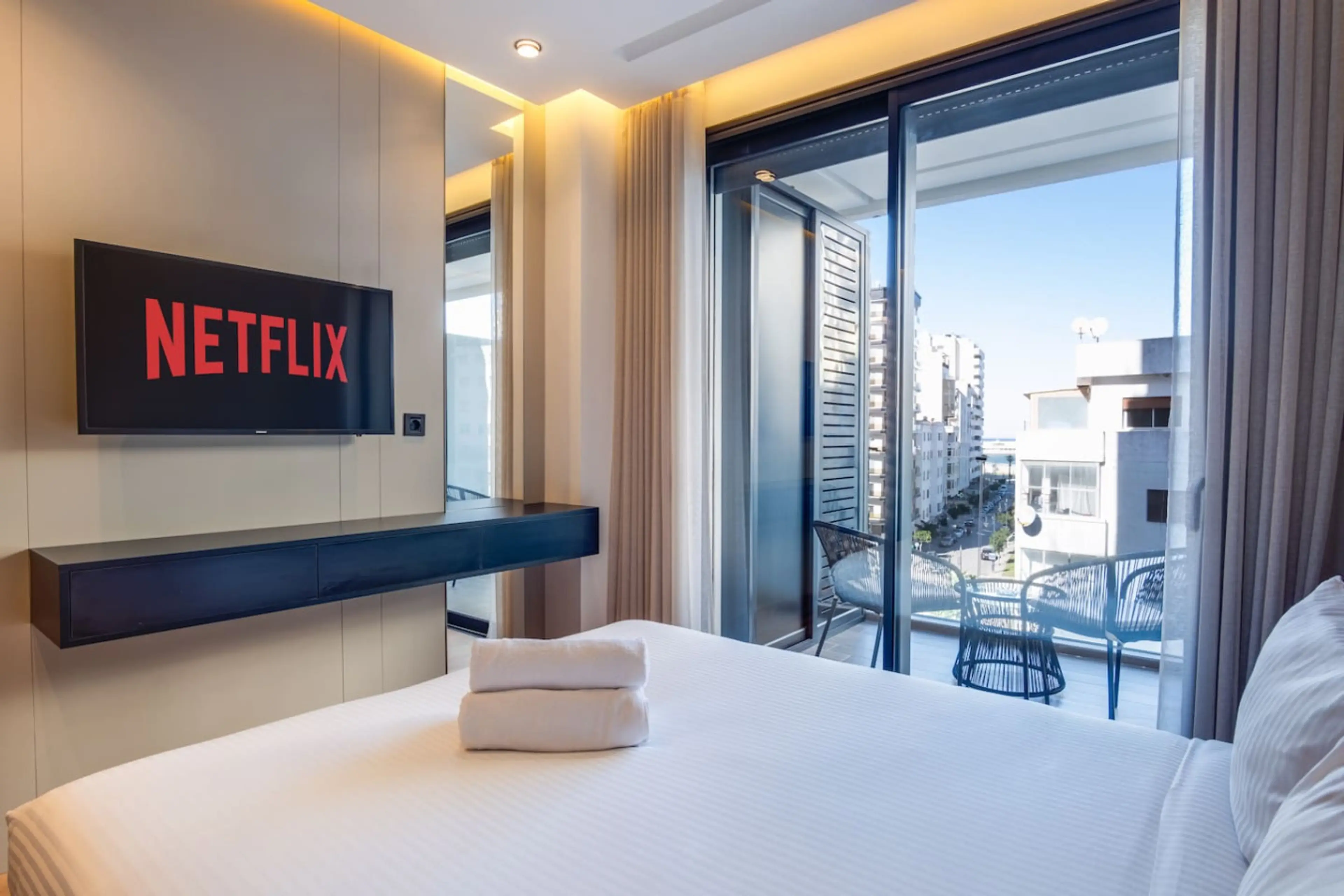 A stylish apartment in a new building just a few steps from the beach, offering a pleasant partial beach view from the living area. It includes a refined bedroom with comfortable beds, central air-conditioning (cooling & heating), a large smart TV with Netflix and premium channels, and an open kitch...